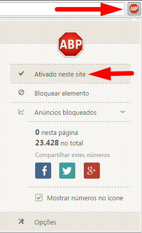 No canto superior direito do Chrome ou Firefox, clique no ícone da ABP, e desmarque a caixa "Ativar Adblock Plus".